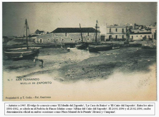 PLAZA MANUEL DE LA PUENTE “ALVAREZ y CAMPANA” . Su nombre se propuso por primera vez el día 24 de enero de 1896 , y de nuevo el día 28 de febrero de 1896. Aparece citada en el padrón de fincas isleñas, entre los años 1801/1862 como Albina del caño del Saporito.