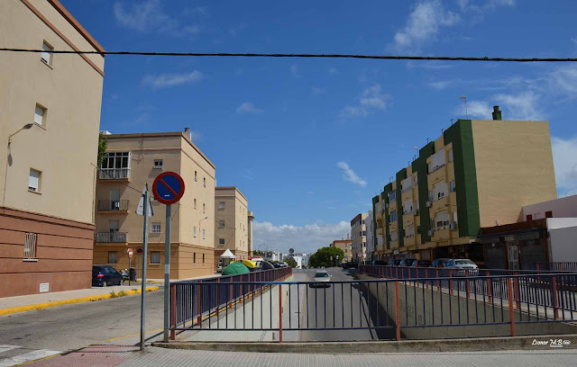 Comienzo de este vial que tiene la misma dirección que la calle Felipe II. El punto de encuentro de ambas es una pendiente que salva la diferencia de altura de los terrenos de la Barriada de Carlos III y los del Manchón de las Anclas donde está la Barriada Bazán.